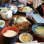 朝ごはんは黒豚のしょうが焼き膳とロースカツ膳。真ん中にあるのはお冷やじゃなくて森伊蔵のロック!贅沢過ぎるー
